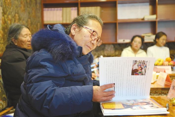 圖為昌都市婦聯(lián)組織老黨員干部查看“70人70事獻(xiàn)禮畫(huà)冊(cè)”。