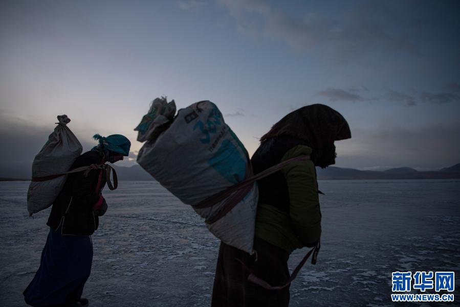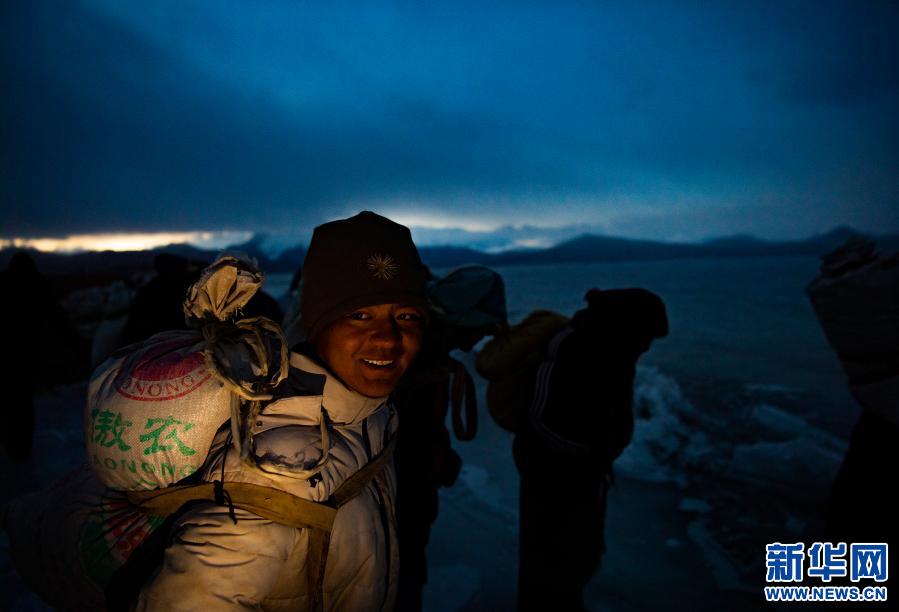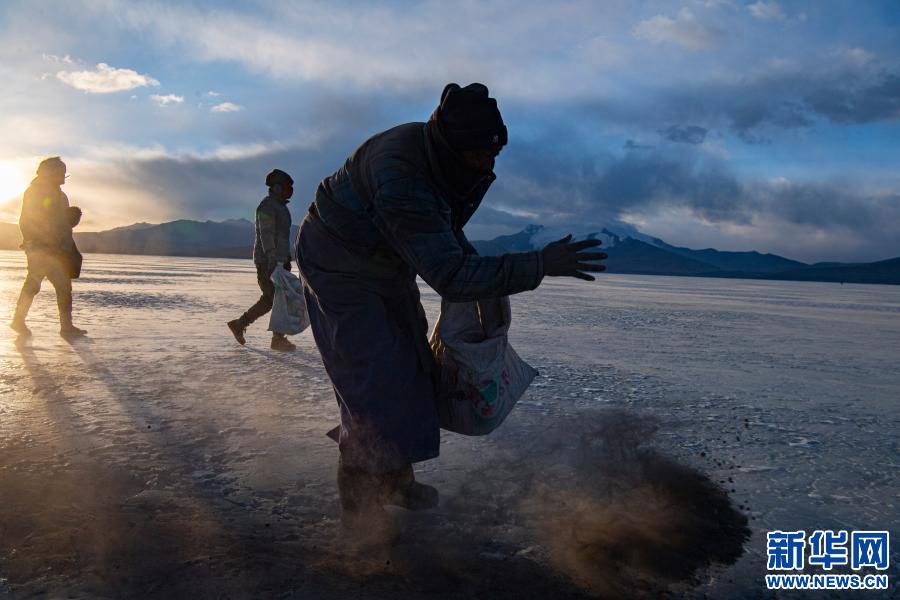 西藏山南市浪卡子縣堆瓦村的村民清晨背著牛糞爐灰來到普莫雍錯湖邊,準(zhǔn)備修通安全小路(3月6日攝)。新華社記者 孫非 攝