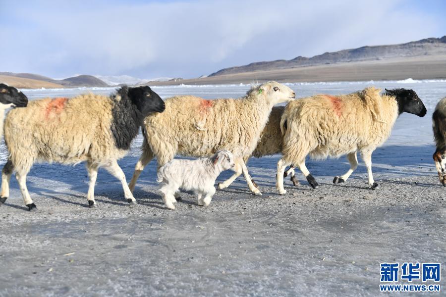 羊群在普莫雍錯湖心島上準(zhǔn)備出發(fā)(3月6日攝)。新華社記者 孫瑞博 攝