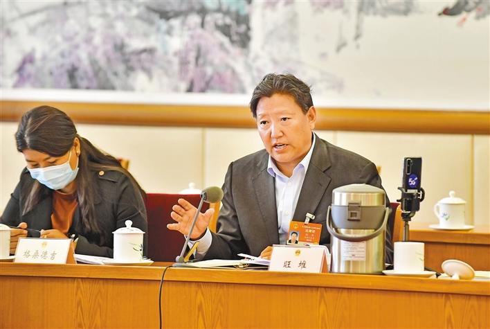 圖為全國人大代表旺堆在十三屆全國人大四次會議西藏代表團(tuán)全體會議上發(fā)言。記者 旦增西旦 攝