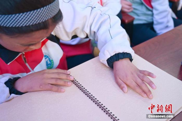 圖為3月11日,拉薩市特殊教育學(xué)校的學(xué)生讀盲文法律宣傳手冊。中新社記者 趙朗 攝