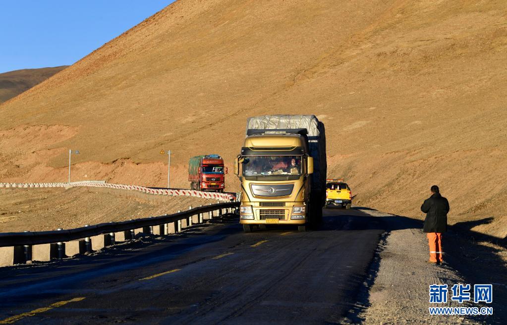 安多公路養(yǎng)護(hù)段巡護(hù)車(chē)和一輛貨車(chē)行進(jìn)在國(guó)道109唐古拉山口路段(1月13日攝)。新華社記者 張汝鋒 攝