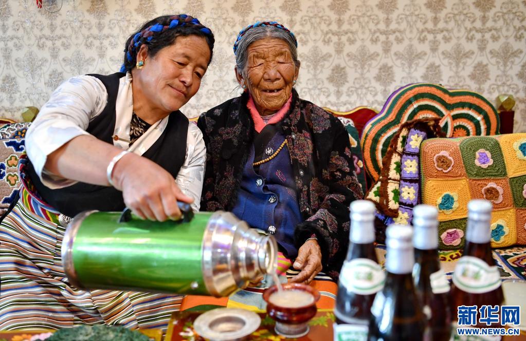 邊巴倉決的鄰居在給老人倒茶(3月19日攝)。新華社記者 張汝鋒 攝