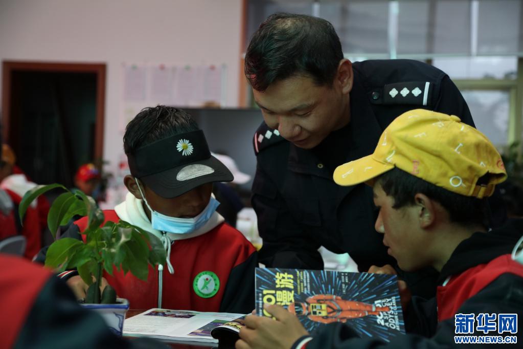亞東出入境邊防檢查站圖書室對駐地中學學生開放,民警為學生講解書本知識(張雨強攝,新華社發(fā))