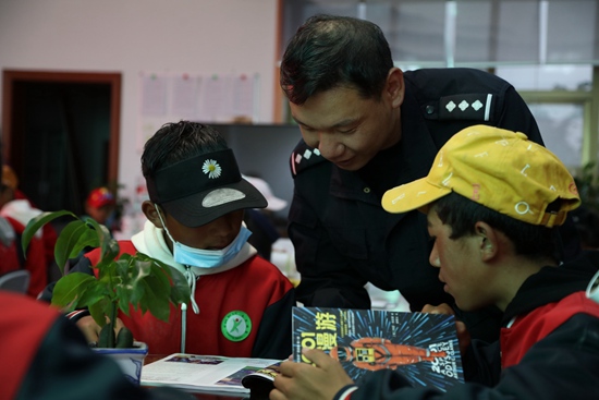 亞東出入境邊防檢查站圖書室對駐地中學學生開放,民警為學生講解書本知識。張雨強 攝