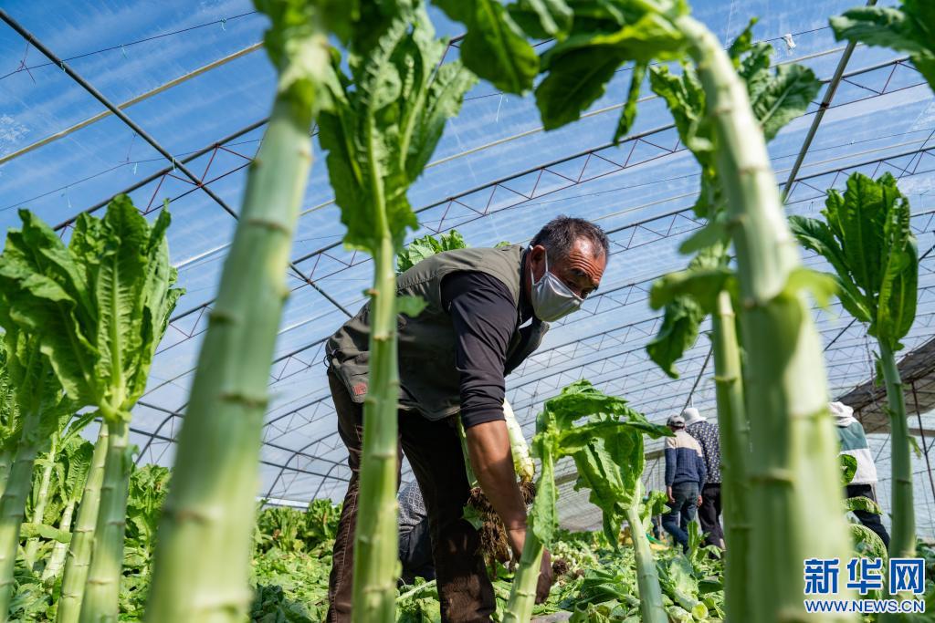 西藏曲水縣南木鄉(xiāng)江村的村民在大棚內(nèi)采摘蔬菜(2020年2月20日攝)。 新華社記者 普布扎西 攝