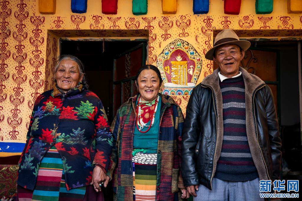 才旦拉姆老人(左)和家里人合影(4月26日攝)。新華社 貢覺群培 攝