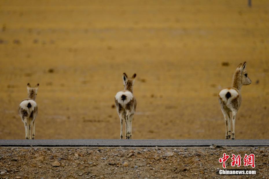 5月2日,三頭藏原羚在西藏那曲雙湖縣穿越公路。當?shù)啬撩穹Q藏原羚為黃羊,是青藏高原特有物種。