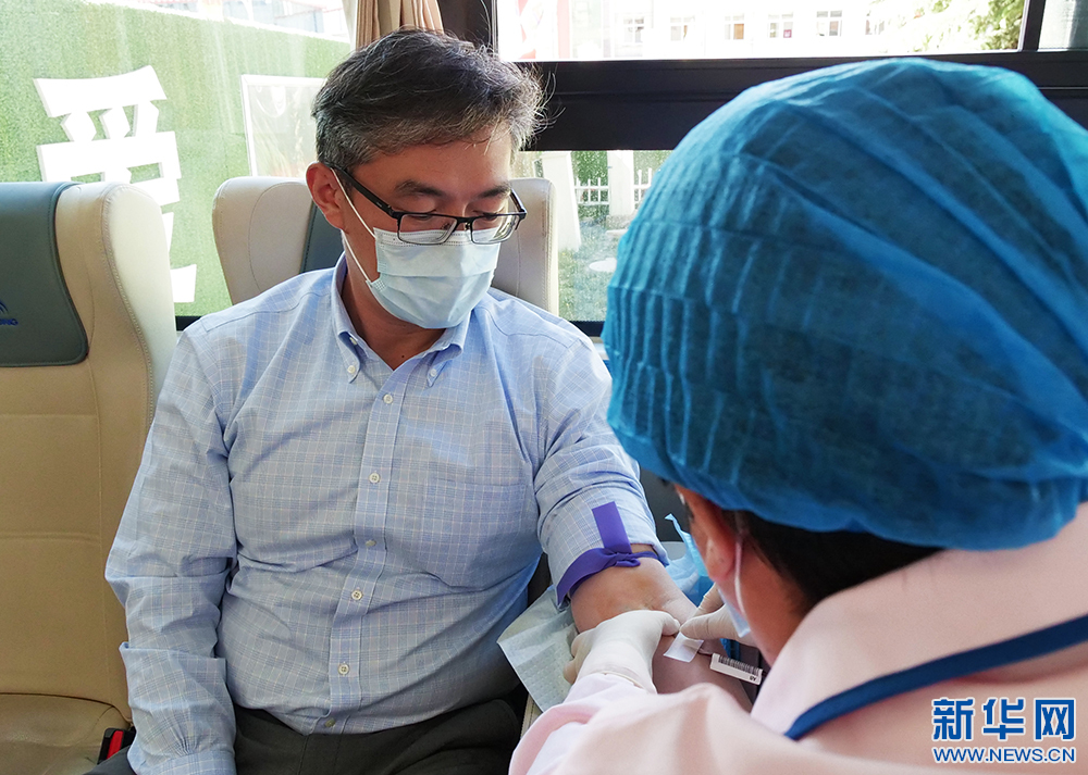 5月27日,來(lái)自北京協(xié)和醫(yī)院的援藏專(zhuān)家楊筱在獻(xiàn)血。(新華網(wǎng) 旦增努布攝)