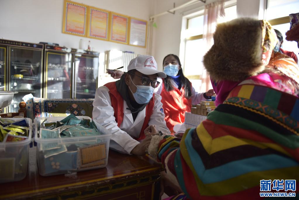 西藏尼瑪縣新時代文明實踐中心志愿者在尼瑪縣五保集中供養(yǎng)服務中心進行義診(2021年2月3日攝)。新華社記者 格桑朗杰 攝
