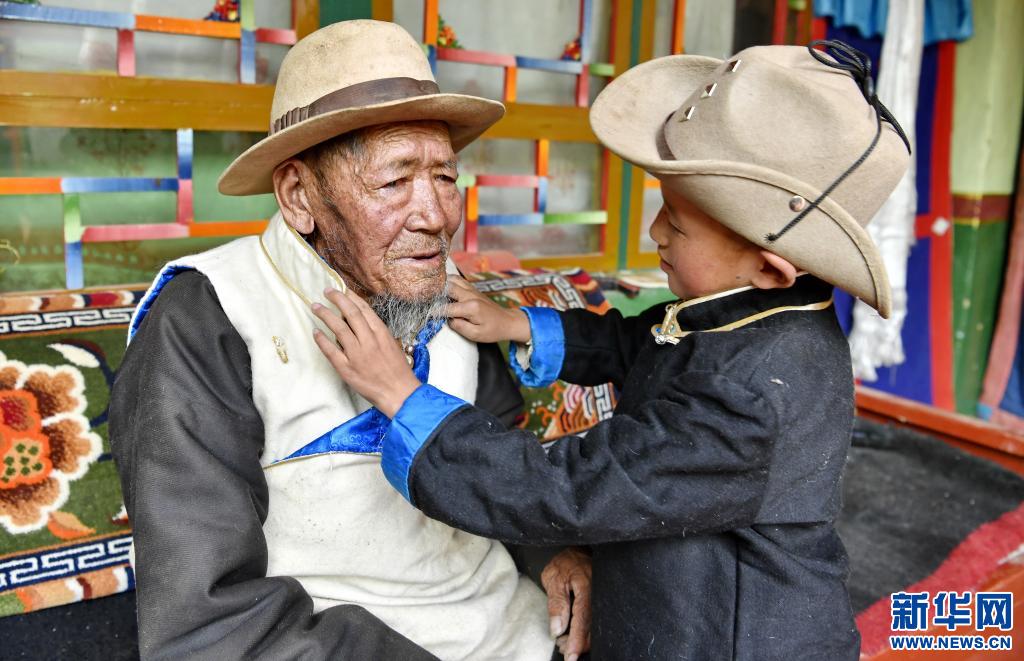 索朗的外孫旦增晉美幫他整理新衣服(4月16日攝)。新華社記者 張汝鋒 攝