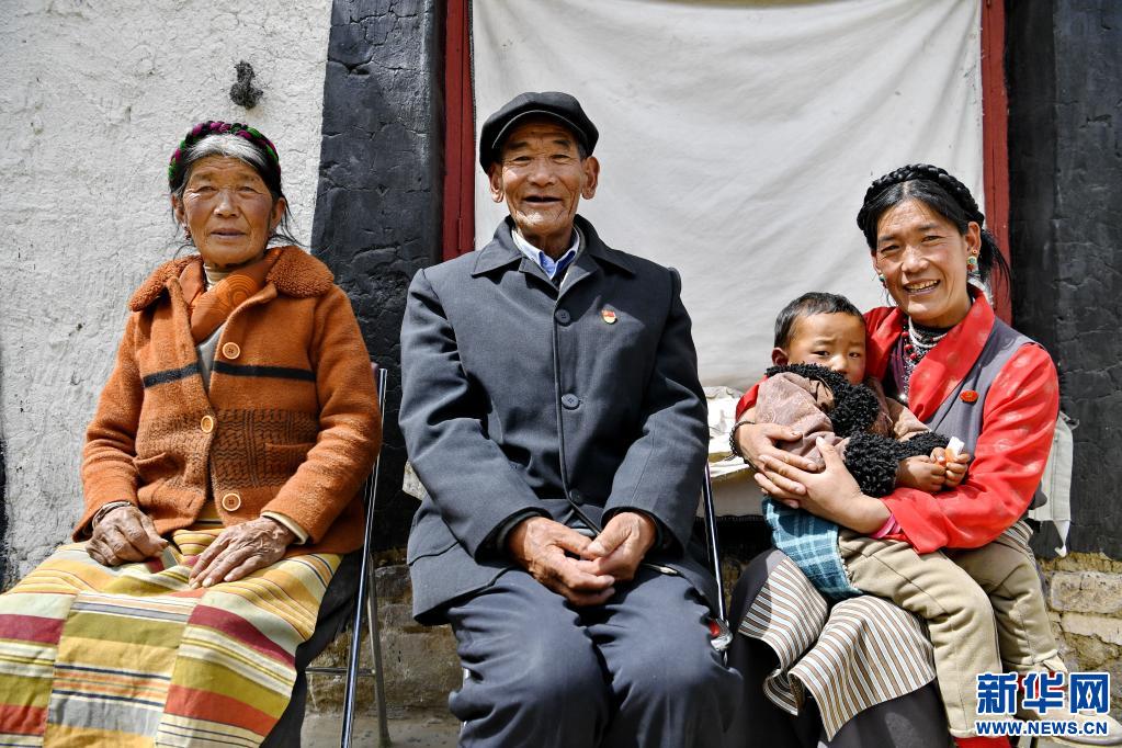 這是米瑪老人(中)與妻子窮達(dá)(左一)、小女兒德吉卓瑪(右一)以及外孫在房前合影(4月18日攝)。新華社記者 張汝鋒 攝