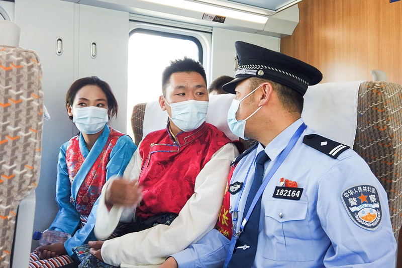 拉薩鐵路公安處乘警支隊民警在“復興號”動車組開展值乘工作。胡傳鑫 攝