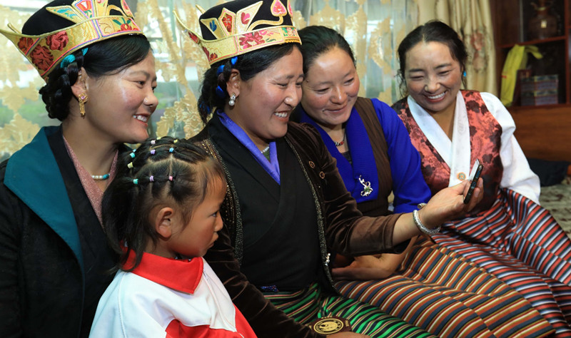 西藏自治區(qū)拉薩市墨竹工卡縣群眾通過(guò)手機(jī)收看慶祝大會(huì)。記者 洛桑 次旺 唐斌 潘多 攝