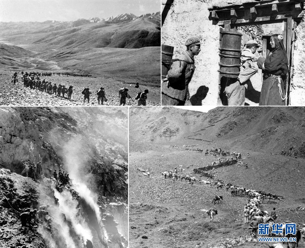 這是一張拼版照片:左上圖為1950年,人民解放軍戰(zhàn)士跋涉在高山峻嶺間向西藏前進(jìn)(資料照片);右上圖為人民解放軍戰(zhàn)士在執(zhí)勤空隙為藏族老百姓背水(資料照片,張正模攝);左下圖為筑路戰(zhàn)士在懸崖絕壁上修建川藏公路(資料照片);右下圖為1951年7月,解放軍第十八軍進(jìn)藏先遣部隊(duì)行進(jìn)在瓦合山上(新華社記者袁克忠攝)。新華社發(fā)