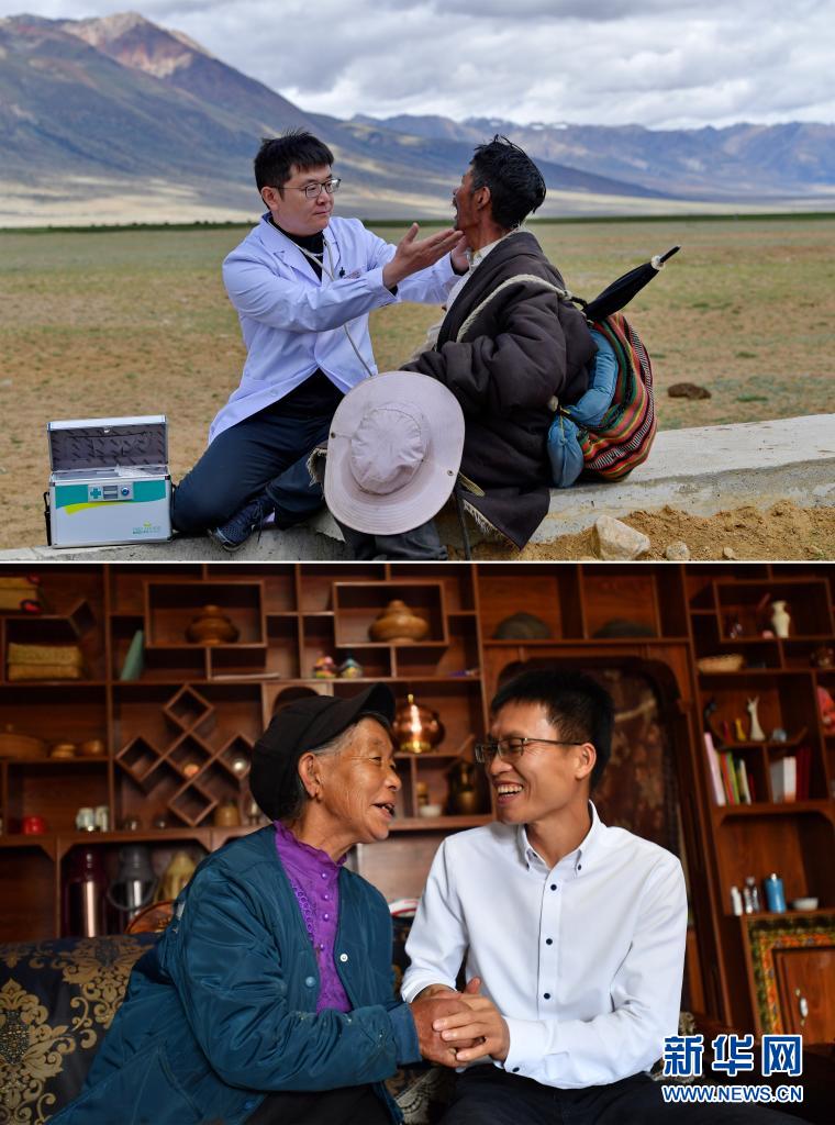 這是一張拼版照片:上圖為北京援藏醫(yī)生王克明(左)在西藏當(dāng)雄縣格達(dá)鄉(xiāng)格達(dá)村牧場(chǎng)為牧民義診(2021年6月19日攝,新華社記者張汝鋒攝);下圖為在西藏林芝市米林縣,廣東援藏干部黃南蔭(右)與珞巴族老阿媽亞加在一起(2021年6月19日攝,新華社記者覺果攝)。新華社發(fā)