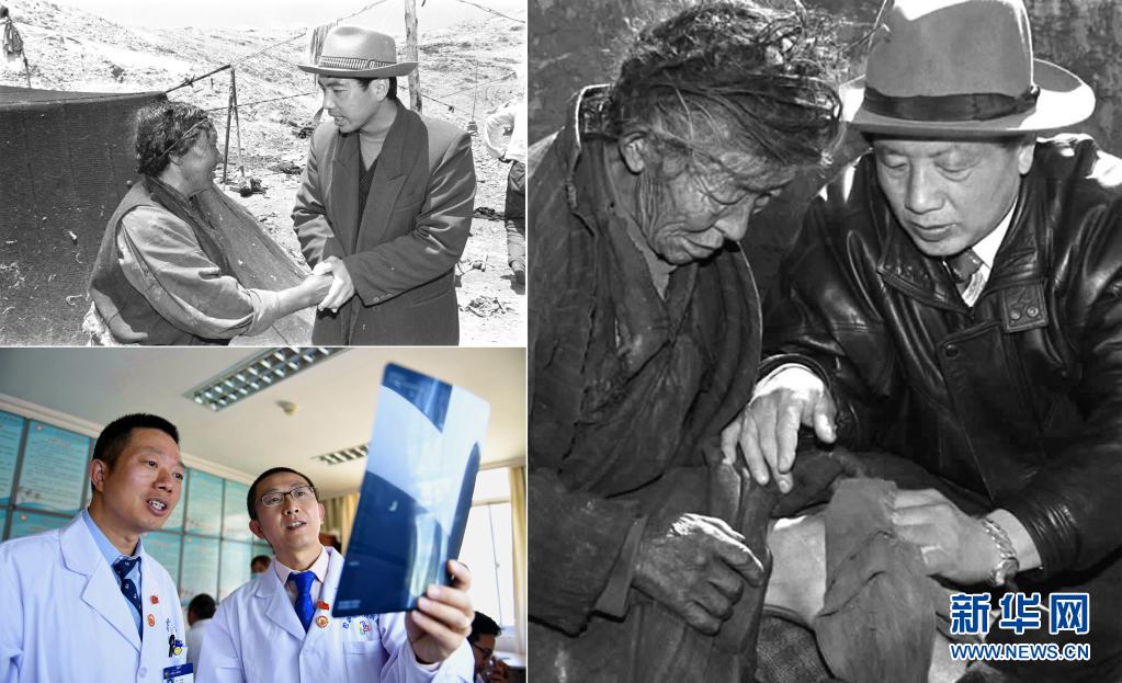 這是一張拼版照片:左上圖為來自陜西的援藏干部、阿里日土縣副縣長(zhǎng)賈冗勇深入牧區(qū),幫助藏族牧民解決生產(chǎn)、生活的實(shí)際困難(新華社記者土登攝,1997年11月11日發(fā));左下圖為2017年8月3日,北京積水潭醫(yī)院援藏醫(yī)生龔曉峰(右)和北京天壇醫(yī)院援藏醫(yī)生李家謀在拉薩市人民醫(yī)院骨科病房?jī)?nèi)查看患者的X光片,進(jìn)行工作交接(新華社記者晉美多吉攝);右圖為孔繁森(右)在阿里日土縣過巴鄉(xiāng)為孤寡老人益西卓瑪治?。ㄐ氯A社記者土登攝,1994年12月26日發(fā))。新華社發(fā)
