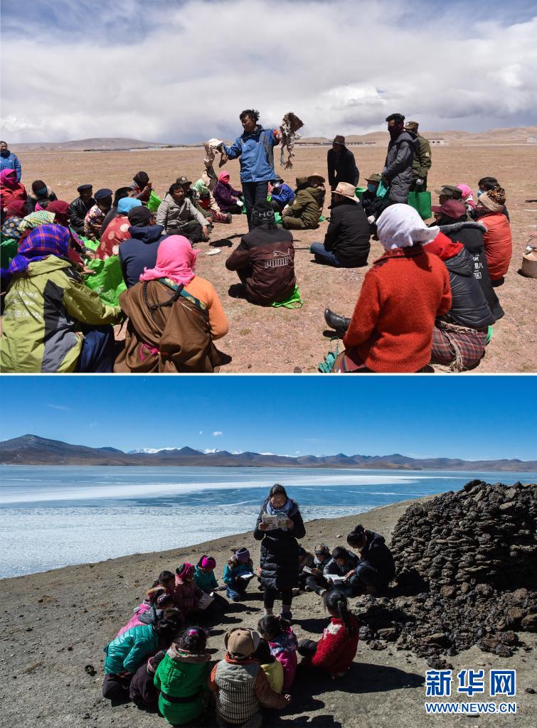這是一張拼版照片:上圖為瑪曲鄉(xiāng)黨委書記朗卡江村(中)向參加活動(dòng)的村民講解如何區(qū)分可回收垃圾與不可回收垃圾(2019年5月28日攝,新華社記者周錦帥攝);下圖為在海拔約5000米的西藏山南市浪卡子縣堆瓦村,駐村工作隊(duì)員貢曲(中)和次仁倉(cāng)決(右一)給放假的孩子補(bǔ)習(xí)功課(2017年2月9日攝,新華社記者普布扎西攝)。新華社發(fā)