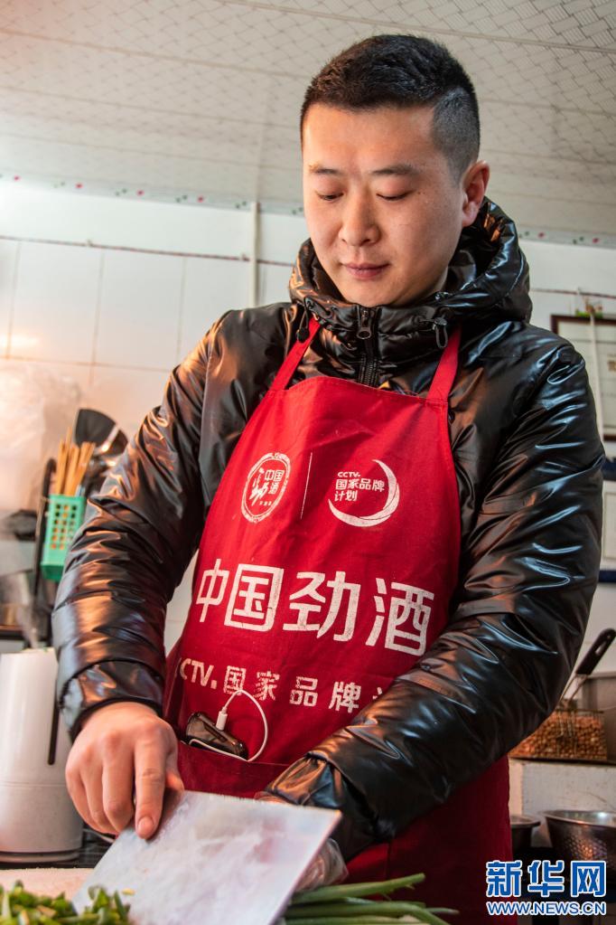 高原在自家的涼菜店中切菜(3月25日攝)。新華社記者 陳尚才 攝