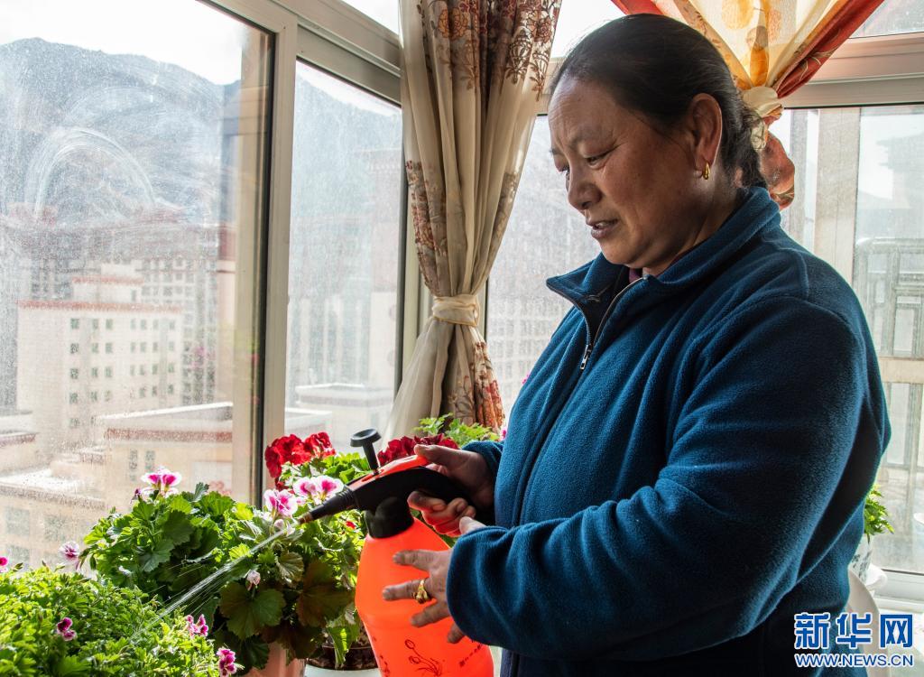 昌都市卡若區(qū)城關鎮(zhèn)居民永西在新家中給花草澆水(3月25日攝)。新華社記者 陳尚才 攝