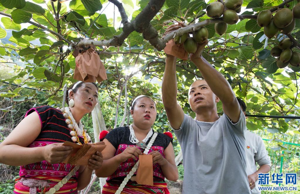 在西藏自治區(qū)林芝市察隅縣下察隅鎮(zhèn)京都村,獼猴桃園管理員高峰(右)在指導(dǎo)當(dāng)?shù)卮迕窠o獼猴桃果實(shí)套紙袋(7月22日攝)。京都村通過“公司+農(nóng)戶”模式引進(jìn)了獼猴桃種植,幫助村民增收。新華社記者 金立旺 攝