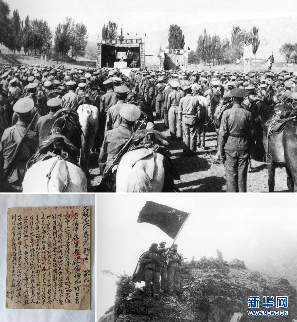 這是一張拼版照片,上圖為:1950年8月1日,獨立騎兵師一團在新疆于田縣普魯村召開進藏誓師大會(資料照片,進藏英雄先遣連紀念館供圖);左下圖為:先遣連烈士陳忠義的家書(受訪者供圖);右下圖為:1951年,阿里和平解放(資料照片,進藏英雄先遣連紀念館供圖)。新華社發(fā)