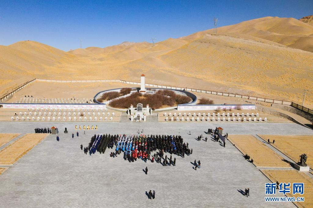 清明時節(jié),西藏阿里的黨員干部、解放軍、學生及群眾,聚集獅泉河烈士陵園,祭奠英靈(2021年4月4日攝,無人機照片)。新華社記者 張兆基 攝
