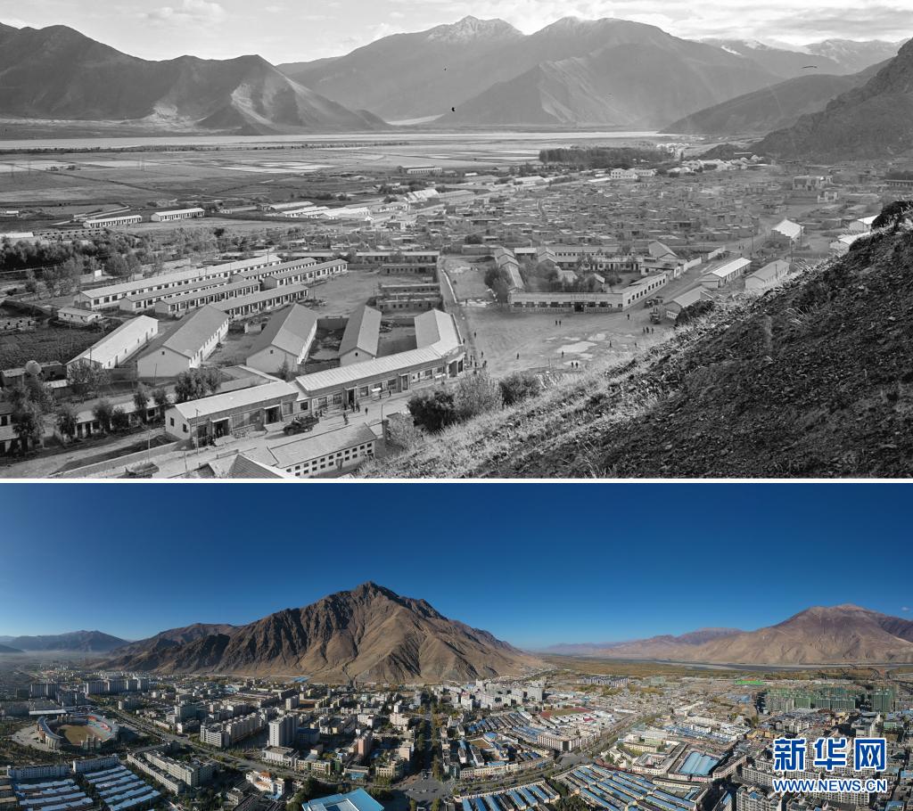 拼版照片:上圖是20世紀(jì)70年代的西藏山南地區(qū)澤當(dāng)鎮(zhèn)景象(新華社記者顧綬康攝);下圖是2020年11月26日拍攝的山南澤當(dāng)鎮(zhèn)風(fēng)貌(新華社發(fā) 次仁龍布攝,無人機(jī)照片)。新華社發(fā)