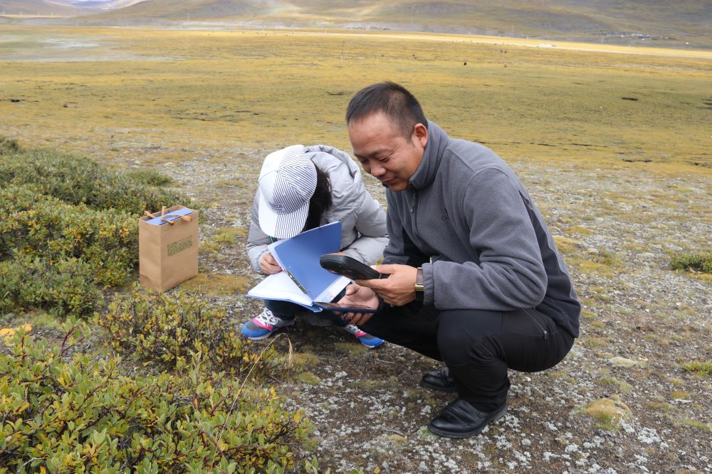 郝偉(右)和團(tuán)隊(duì)工作人員在野外采集植物樣本數(shù)據(jù)。受訪者供圖