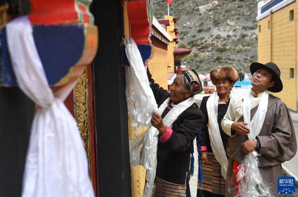 西藏山南市洛扎縣洛扎鎮(zhèn)居民旦增曲珍(左)給新房獻哈達(2019年9月21日攝)。新華社記者 晉美多吉 攝