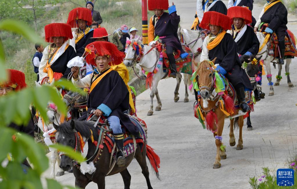 易地扶貧搬遷新村——西藏山南市加查縣冷達鄉(xiāng)共康村村民們身著盛裝歡度“望果節(jié)”(7月9日攝)。新華社記者 張汝鋒 攝