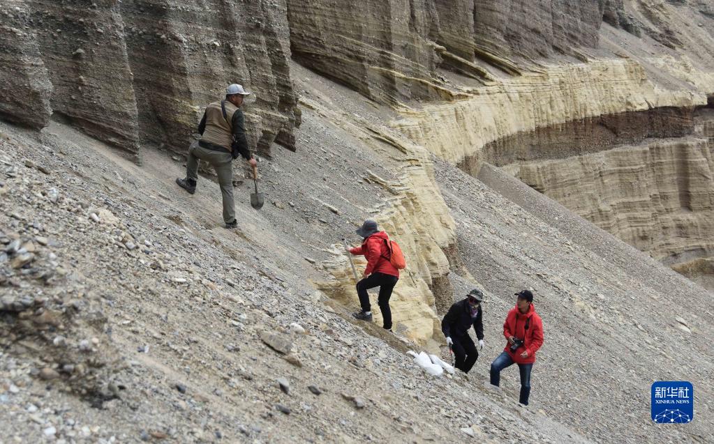 8月27日,科考隊(duì)員在西藏日喀則市定結(jié)縣一個(gè)垂直地面的沉積剖面工作。新華社記者 杜剛 攝