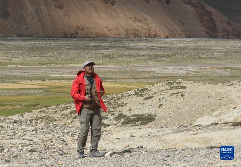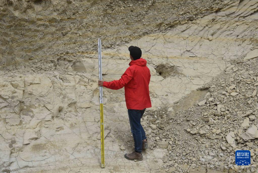 8月27日,在西藏日喀則市定結(jié)縣一處山體,科考隊(duì)員郭劍使用標(biāo)尺,測(cè)量湖相沉積物厚度。新華社記者 杜剛 攝