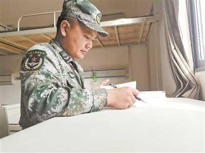 吳杰在宿舍寫日記。圖片由巴弄卓康哨所官兵提供