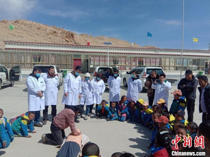 醫(yī)療隊(duì)為波絨鄉(xiāng)中心小學(xué)師生進(jìn)行心肺復(fù)蘇現(xiàn)場(chǎng)培訓(xùn)。煙臺(tái)援藏醫(yī)療隊(duì)供圖