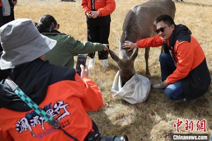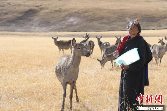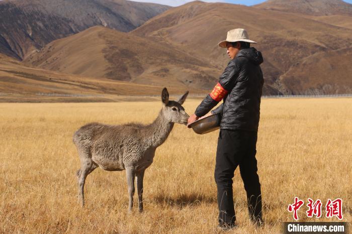圖為西藏類烏齊馬鹿國家級自然保護區(qū)的管護員正在飼喂馬鹿。冉文娟 攝