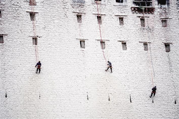 據(jù)悉,工作人員要先對涂料進(jìn)行過濾,然后再進(jìn)行噴灑。而人力無法抵達(dá)的地方則由專業(yè)人員化身“蜘蛛人”用涂料噴槍進(jìn)行粉刷。在高空作業(yè)的“蜘蛛人”是經(jīng)過培訓(xùn)的特定人員,“蜘蛛人”懸掉在空中,并有專人負(fù)責(zé)拉繩,大家齊心協(xié)力完成粉刷工作。