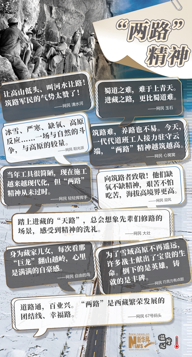 “天路”巍峨,精神閃光。當雪域高原換了人間,新一代建設(shè)者正接過接力棒,在新時代續(xù)寫著新的傳奇?!敖裉欤淮腊喙と私恿︸v守云端,‘兩路’精神越筑越高”,正如網(wǎng)民所說,無論過去、現(xiàn)在和將來,“兩路”精神都是西藏各族人民建設(shè)幸福家園的力量源泉和精神動力,也必將激勵中華兒女為了更加美好的明天繼續(xù)奮斗、前行。(文字:馬若虎 海報設(shè)計:王曄)
