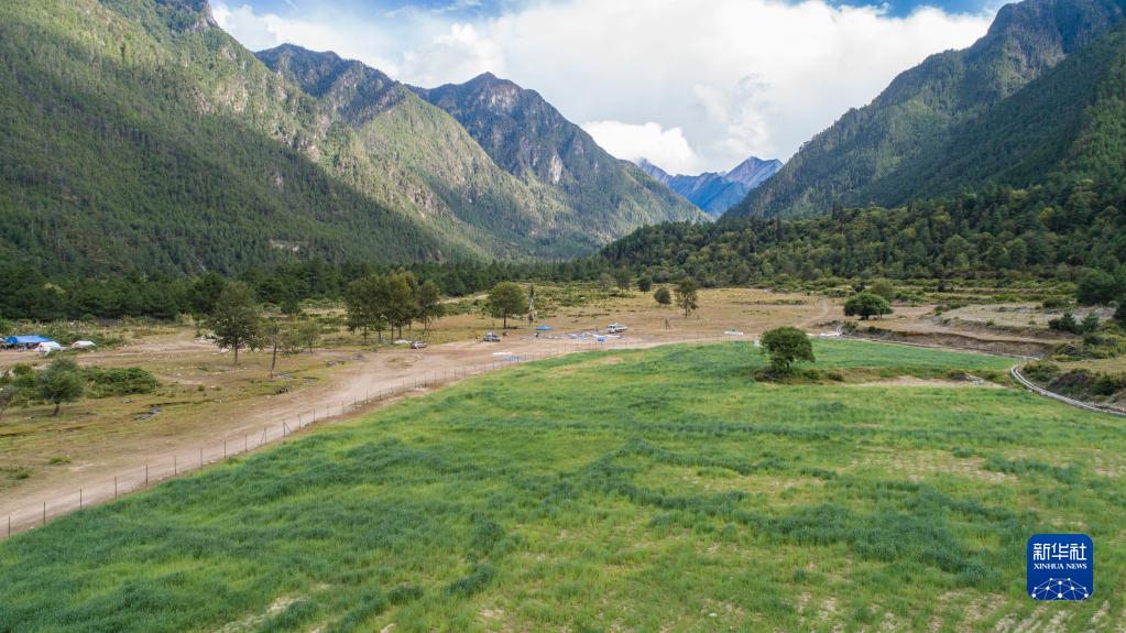 西藏林芝市米林縣,“綠哈達(dá)行動”中種植的人工草場郁郁蔥蔥(2020年9月13日攝,無人機(jī)照片)。 新華社記者孫非 攝