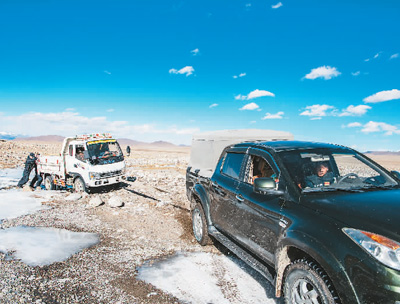 派出所的移民管理警察在巡邏途中協(xié)助牧民旦增多杰一家拖拽“罷工”的小貨車。新華社記者 孫非攝