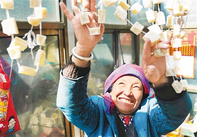 普瑪江塘鄉(xiāng)婦女在晾曬奶渣。新華社記者 普布扎西攝