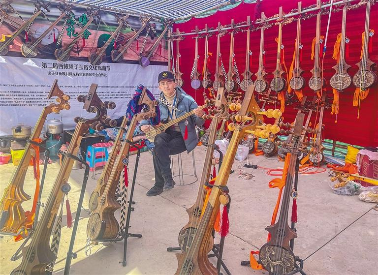 圖為銷售民族樂器的商戶正在為消費(fèi)者現(xiàn)場(chǎng)彈奏“扎念”。
