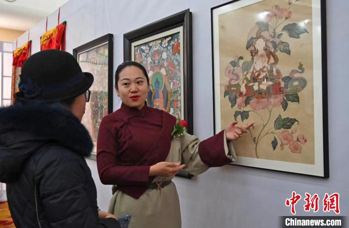 王天文是該協(xié)會(huì)為數(shù)不多的女性,自幼學(xué)習(xí)國(guó)畫(huà)。此次她的展出作品《花與佛》進(jìn)行了唐卡創(chuàng)新,將漢地工筆繪法的花卉與唐卡白度母形象融合。因?yàn)闊釔?ài)藏文化,2011年她從家鄉(xiāng)河北到西藏學(xué)習(xí)唐卡,希望能探索唐卡與不同繪畫(huà)種類(lèi)方式的結(jié)合。