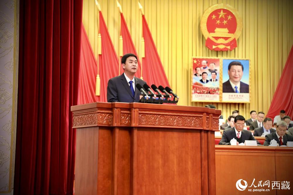 西藏自治區(qū)人民政府代理主席嚴金海向大會作政府工作報告。人民網 次仁羅布攝