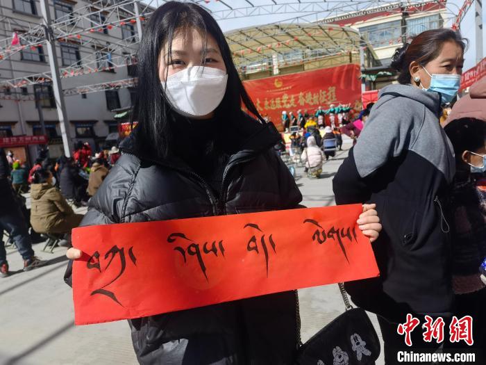 圖為青少年展示藏文對(duì)聯(lián)"扎西德勒"?!」睬鄨F(tuán)西藏自治區(qū)委員會(huì)供圖