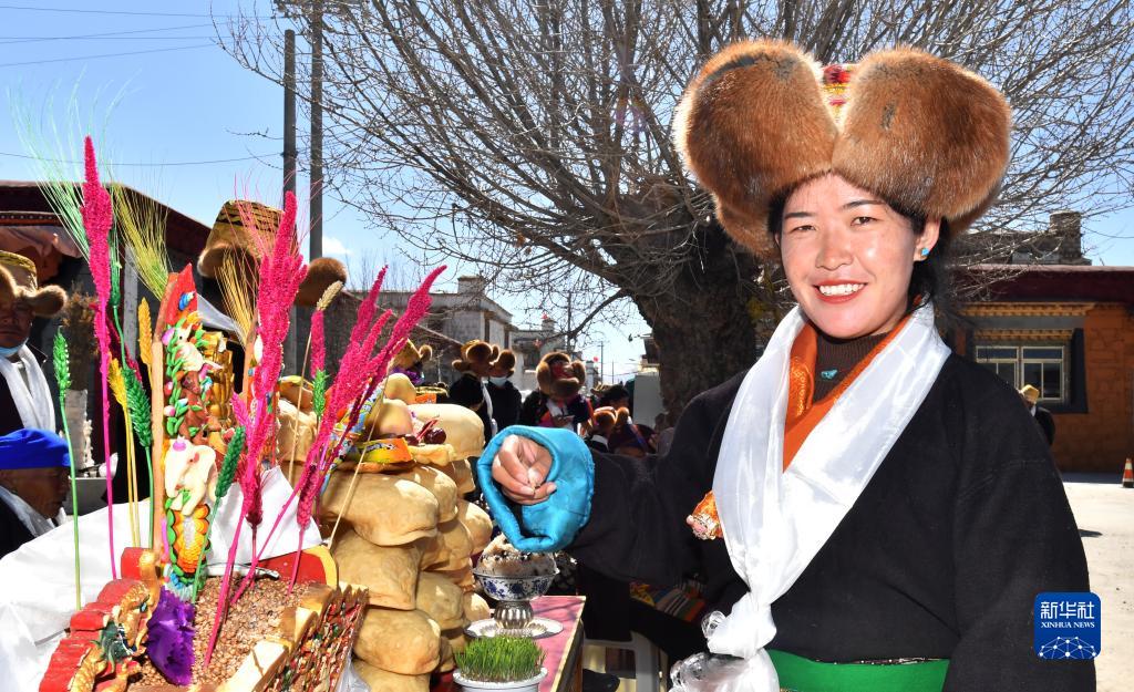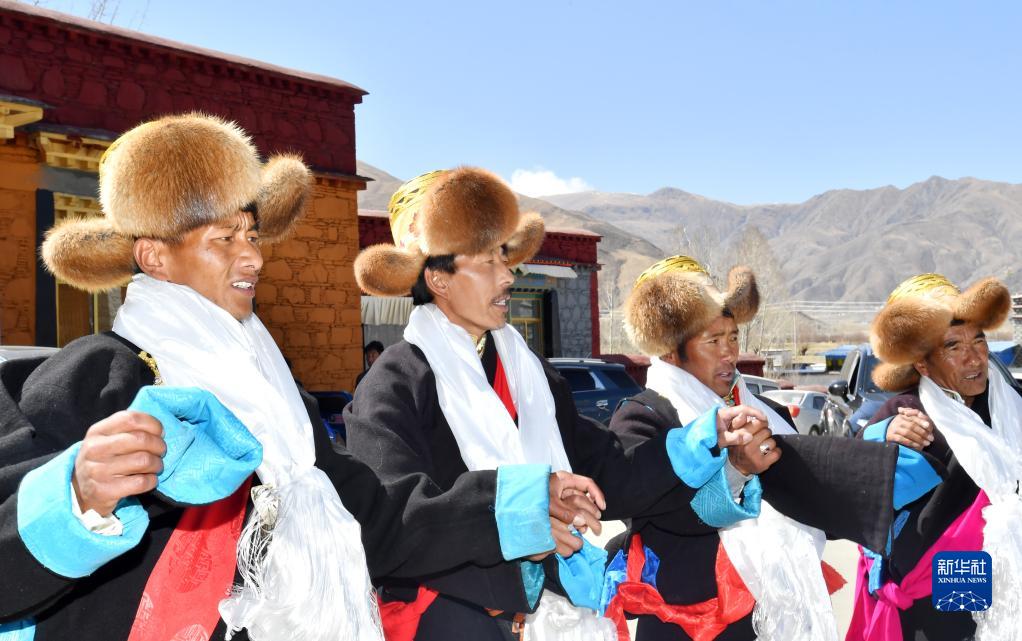 3月3日,西藏山南市貢嘎縣崗堆鎮(zhèn)農(nóng)民穿著嶄新的氆氌藏裝參加藏歷新年活動(dòng)。新華社記者 覺(jué)果 攝