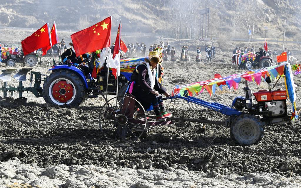 日頭漸高,春耕儀式準(zhǔn)備就位。門中崗社區(qū)黨總支書記央金卓嘎說:“開耕嘍!”頓時(shí),14臺(tái)拖拉機(jī)發(fā)出隆隆轟鳴聲,肥沃的田地被犁出一道道深深的壟溝。