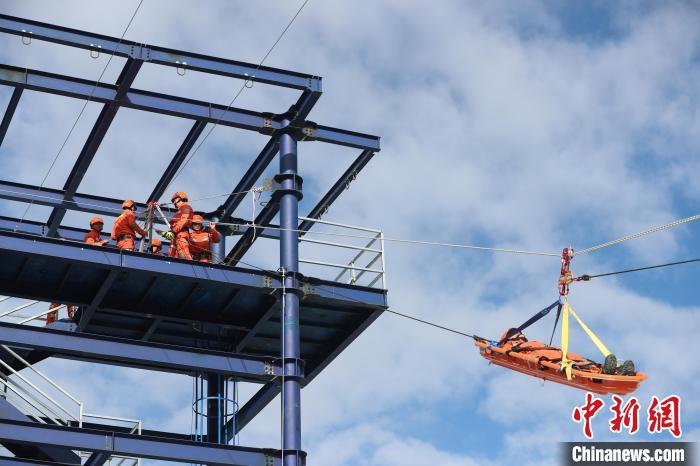 圖為消防指戰(zhàn)員利用橫渡系統(tǒng)轉(zhuǎn)運(yùn)傷員?!×种ナ猩窒乐ш?duì) 攝
