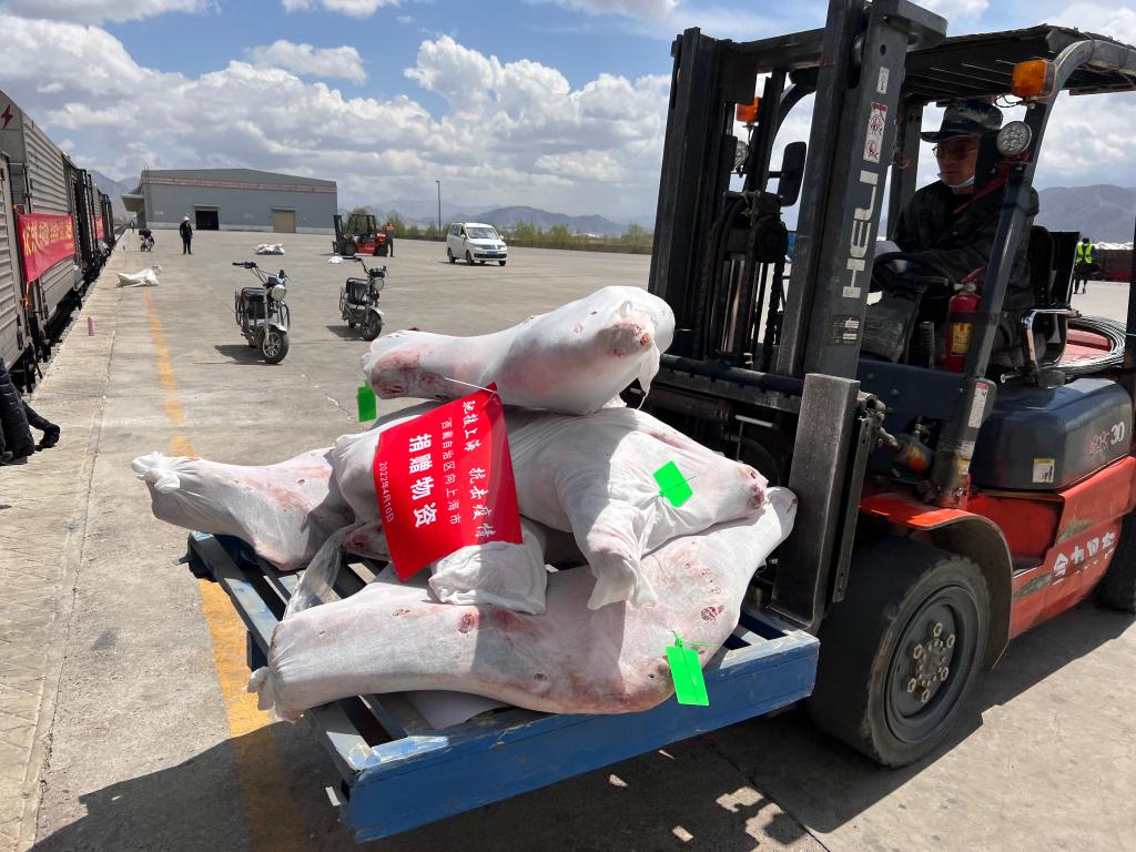 4月10日,鐵路工作人員在西藏日喀則站裝運牦牛肉。(中國鐵路青藏集團有限公司拉薩車務段供圖)