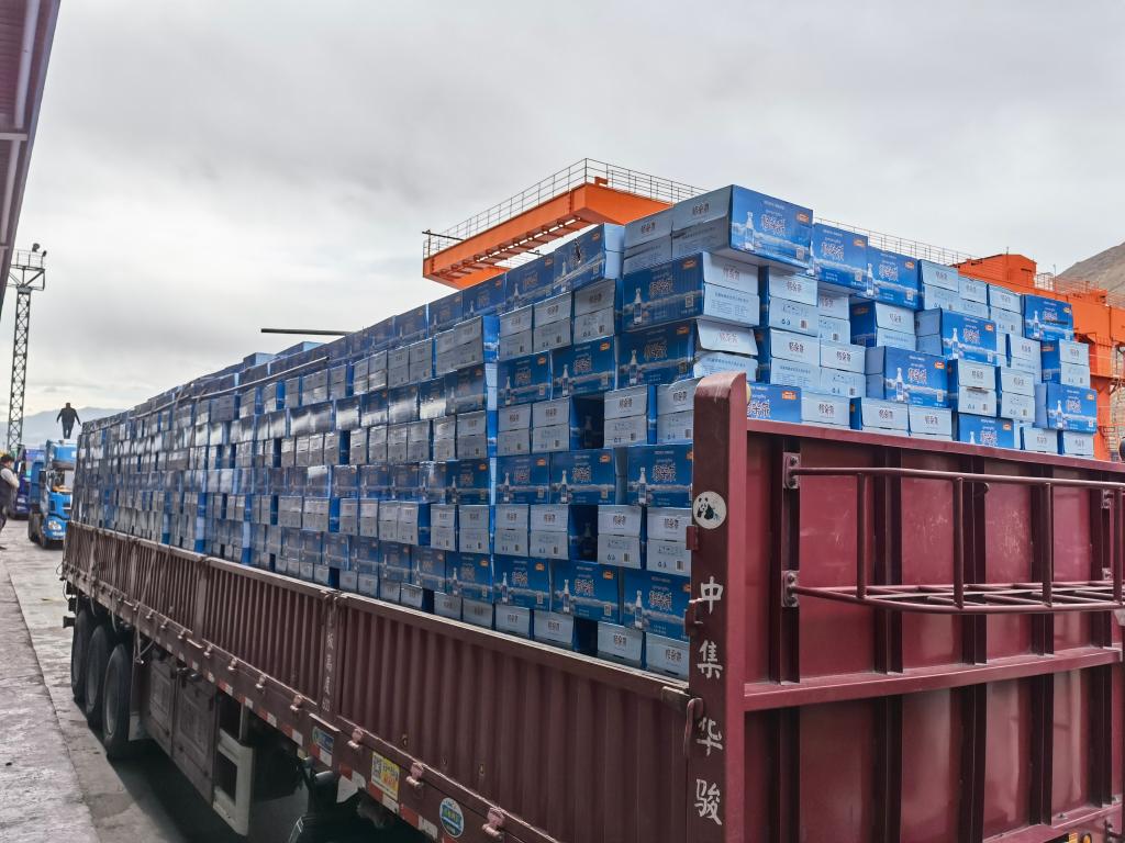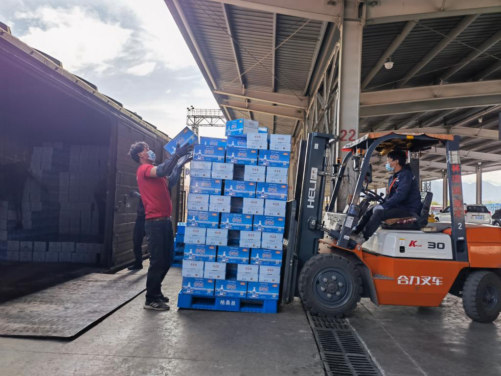 4月10日,運輸?shù)嚼_西站的天然飲用水正等待卸貨裝運。新華社記者 劉洪明 攝